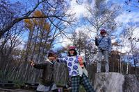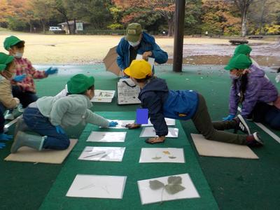 | 11月9日 中央小の1年生と生活科校外学習で森林公園に行きました。雨でしたが、大型テントの下で、葉っぱのかるたをしたり、自然の材料を使って工作をしたりして楽しかったです。 |