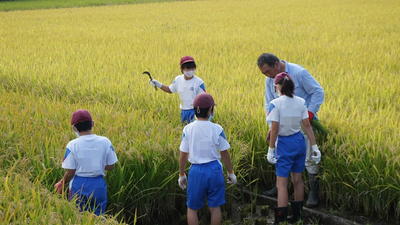 | 5年生 稲刈り。初めはかまを上手に使えませんでしたが、次第にコツをつかんで、早く、きれいに刈れるようになりました。 |