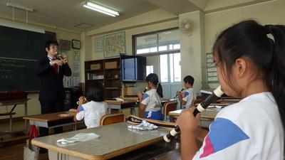 | 10月21日(水)に、ヤマハ楽器からリコーダーの講師の方を招いて講習会を行いました。3年生は、リコーダーを始めたばかりですが、講師の方のリコーダーの美しい音色と大小さまざまなリコーダーを吹いていただき、関心が高まりました。 |