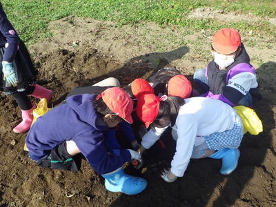 | 5月に植えた苗がすくすくと育ち、たくさんのサツマイモが出来ました。2年生が掘ったサツマイモは、来月の笠っ子なべで、上級生にもおすそわけします。 |
