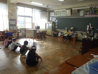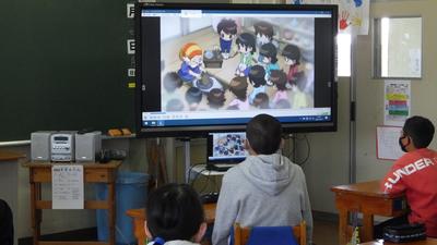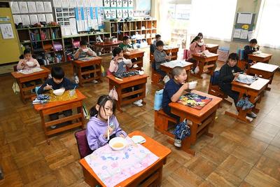 | コロナ感染症対策として、規模を縮小して笠っ子なべを行いました。教員がなべを作り、児童は教室で食べました。なべと一緒に2年生が掘ったサツマイモもおいしく食べました。 |