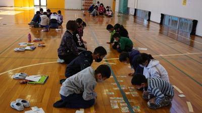 | 笠っ子なべを食べた後、たてわり班ごとにチームをくんで「さいたま郷土かるた大会」「〇×クイズ大会」を行いました。どのチームも1枚でも多くかるたを取るために真剣勝負でした。 |